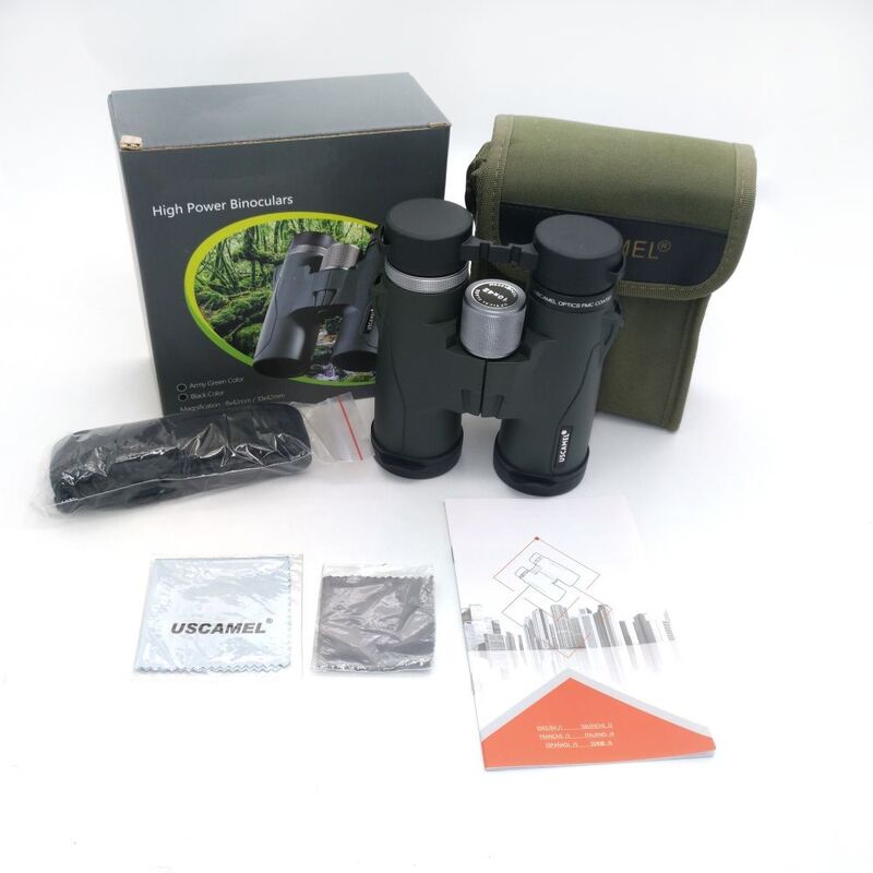 1. HD 10X42 المنظارغطاء العدسة، غطاء العدسة، حزام اليد، علبة صلبة مع حزام حمل، قماش تنظيف ناعم، مربع لون، وإرشادات.